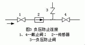 氟塑料襯里傳感器須謹慎地應用于負壓管系;正壓管系應防止產(chǎn)生負壓,例如液體溫度高于室溫的管系,關(guān)閉傳感器上下游截止閥停止運行后,流體冷卻收縮會形成負壓,應在傳感器附近裝負壓防止閥,如圖3所示。有制造廠規(guī)定PTFE 和PFA 塑料襯里應用于負壓管系的壓力可在200C、1000C、1300C時使用的絕對壓力必須分別大于27、40、50KPa。