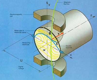 電磁流量計采用電磁感應原理測量介質流體流速的流量計。它在管道的兩側加一個磁場,被測介質流過管道就切割磁力線,在兩個檢測電極上產生感應電勢,其大小正比于流體的運動速度。可以用于測量酸、堿、鹽溶液、水煤漿、礦漿、砂漿灰泥、紙漿、樹脂、橡膠乳、合成纖維漿和感光乳膠等各種懸浮物、氣化汽和粘性物質的流量。