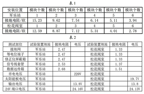 接地網(wǎng)的安裝與連接:接地網(wǎng)是整個(gè)色拉油流量計(jì)防雷試驗(yàn)比較關(guān)鍵的一個(gè)內(nèi)容,能不能準(zhǔn)確的論證試驗(yàn)的有效性,必須保證接地網(wǎng)達(dá)到標(biāo)準(zhǔn)的接地電阻,通過對(duì)實(shí)地地電阻率的測試,初步選擇6個(gè)接地模塊埋設(shè)并配用降阻劑使用,邊安裝邊測試直到達(dá)到標(biāo)準(zhǔn)值后才引入等電位箱。在軍樂站和松花閥室安裝模塊并測試數(shù)據(jù)見表1。