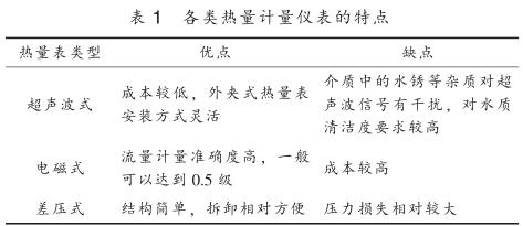 目前供熱行業(yè)內(nèi)使用的熱量計(jì)量?jī)x表按工作原理主要分為超聲波式、 電磁式、 差壓式, 其特點(diǎn)見(jiàn)表 1 。 熱量計(jì)量?jī)x表按結(jié)構(gòu)可分為一體式和分體式, 一體式熱量表將一支入口或出口溫度傳感器嵌入到流量傳感器管道中, 并配有專門的計(jì)算器進(jìn)行熱量計(jì)算; 分體式熱量表采用單獨(dú)的流量傳感器, 包括超聲波流量計(jì)、 電磁流量計(jì)、 差壓流量計(jì)、飽和鹽水流量計(jì)等, 溫度測(cè)量采用單獨(dú)的鉑電阻溫度計(jì)或溫度變送器測(cè)量供回水管道溫度, 再配備熱量積算儀進(jìn)行溫度和流量信號(hào)采集得到熱量值。