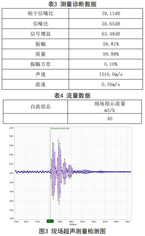 在機組自流補給水狀態:同樣采用德國FLUEX 高精度外夾式超聲波流量計作為標準流量計,測量 基礎數據:管道外徑276.93mm,管壁厚度12.40mm, 采用兩聲程169mm傳感器安裝距離,通過對超聲波流量計信號分析與診斷(數據見表3和表4),超聲 波流量計測量狀態符合條件,開始測量,打開凝汽 器入口閥門,流量測量情況如下