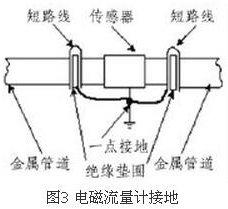 (4)盡量避開振動(dòng)源、磁源(大功率電機(jī)、變壓器)由于水電磁流量計(jì)的測量感應(yīng)電壓很小,電壓較低,易受外界電磁噪聲的影響,故在安裝時(shí)應(yīng)進(jìn)行可靠的接地連(跨)接。金屬管道水電磁流量計(jì)接地連(跨)接方法如圖3所示